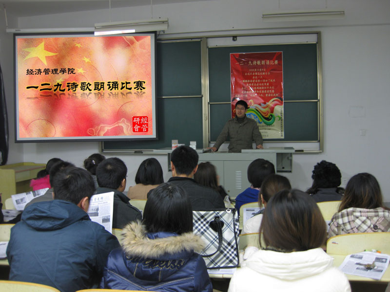 选手们共进行三轮比赛。第一轮以组为单位,同组选手一起上场,做简单自我介绍,然后朗诵规定情景诗歌;在第二轮比赛中,第一轮比赛的前二十名选手朗诵自选诗歌;前十名进入决赛,该轮比赛中,每位选手朗诵一遍规定的诗歌,最后选出前三名。两轮以后,进入决赛的选手们实力都很强,可谓是旗鼓相当,不分伯仲,比赛也进入了白热化阶段。最后,经过激烈的角逐,比赛决出一等奖一名,二等奖两名,最佳风采奖一名。