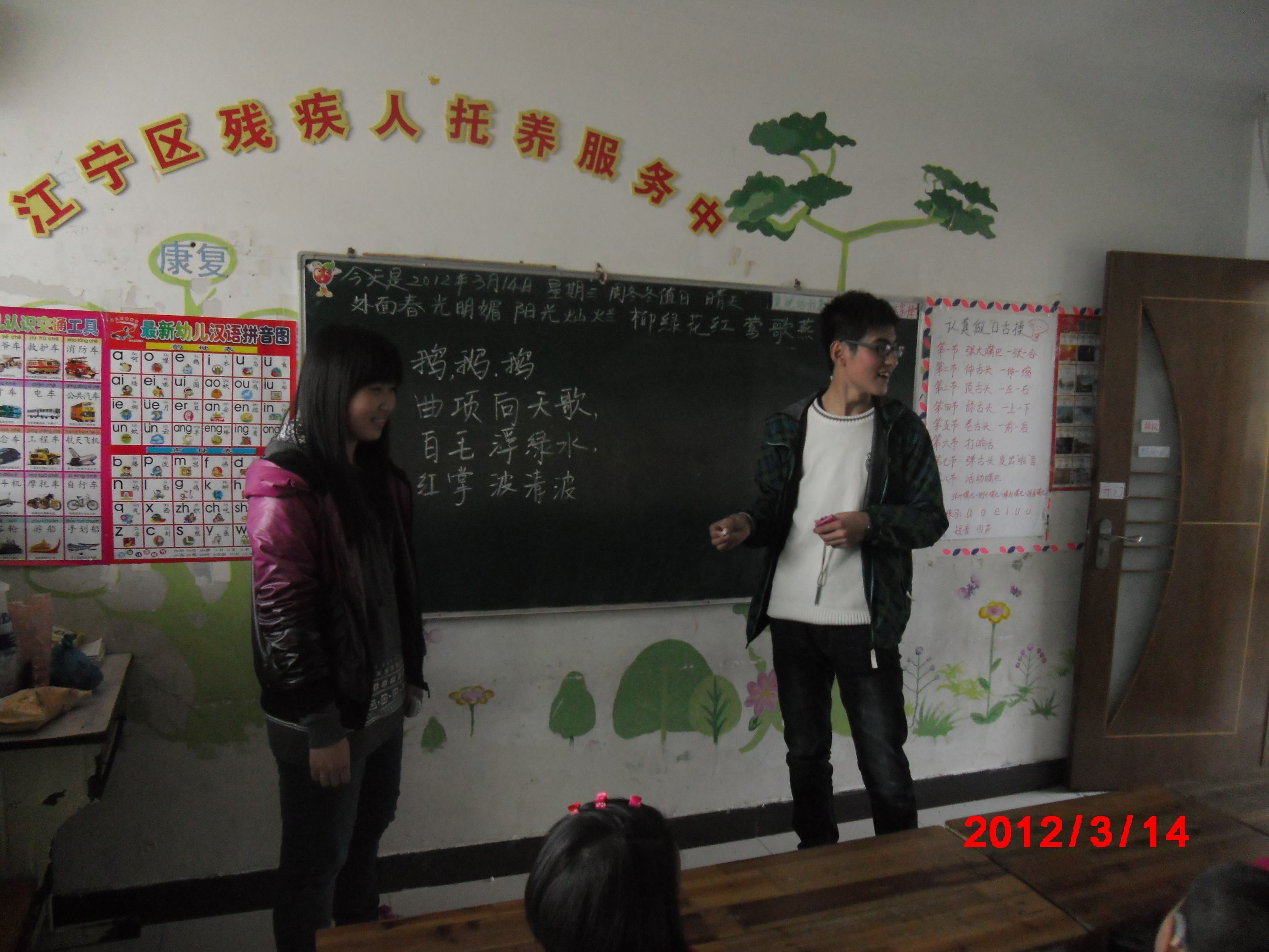 3月14日、3月15日,bat365官网14C112班同学分成两组分别在班长刘欢欢、团支书沈欣带领下两次来到南京市婷婷聋哑幼儿园,关爱残疾儿童,给他们带来欢乐与温暖。此次活动的主题是“续写《雷锋日记》弘扬先锋精神”,它生动地诠释了关爱社会弱势群体的具体做法,点明了14C112班此次活动的目的,更表明了经管学子誓作先锋的决心。