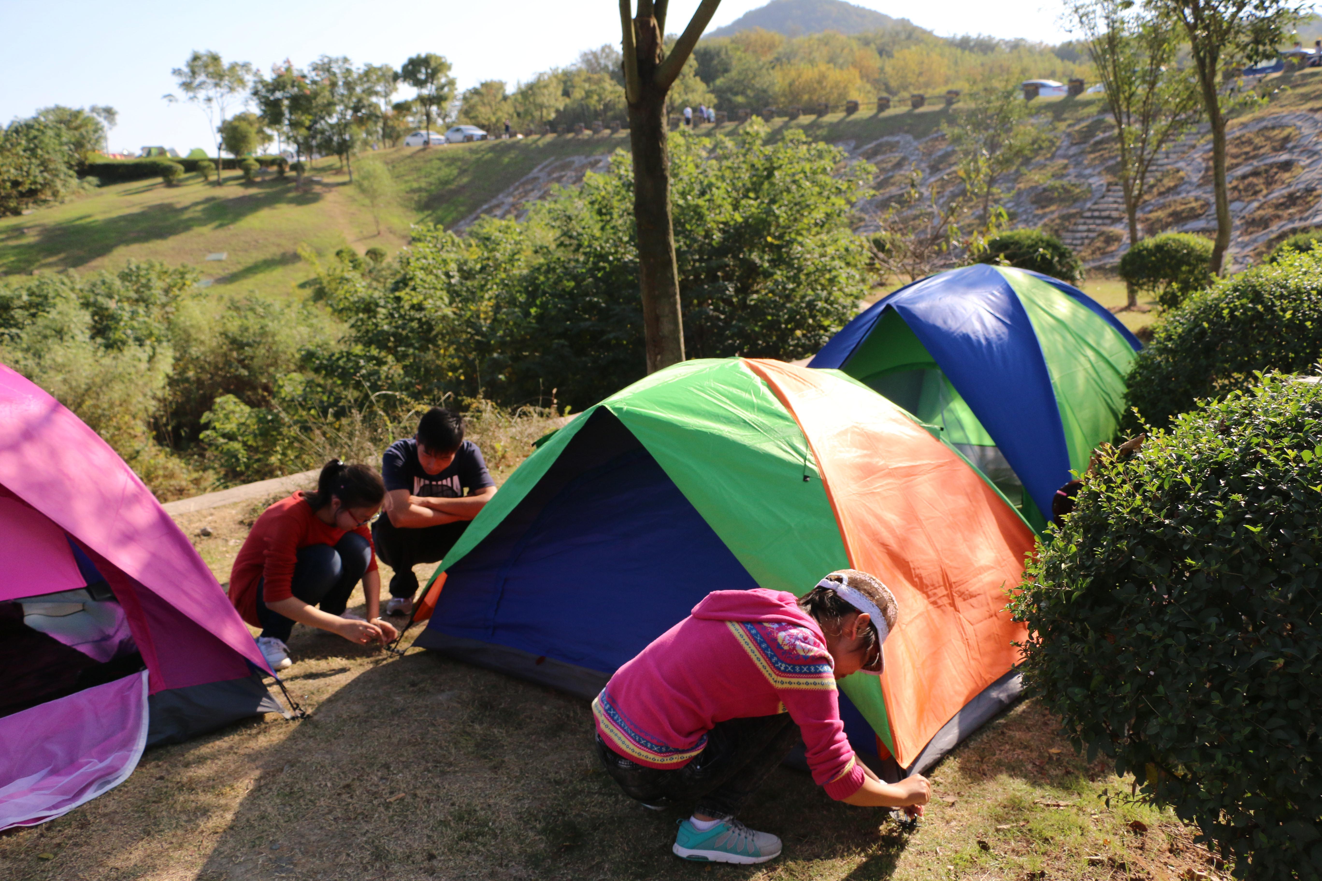 下午,在余下成员安全抵达地点后,大家便在指导下齐心协力完成了搭帐篷任务。每个帐篷可睡2~3个人,并配有气垫和睡袋,可起到防潮和保暖的作用,保证了大家的安全。