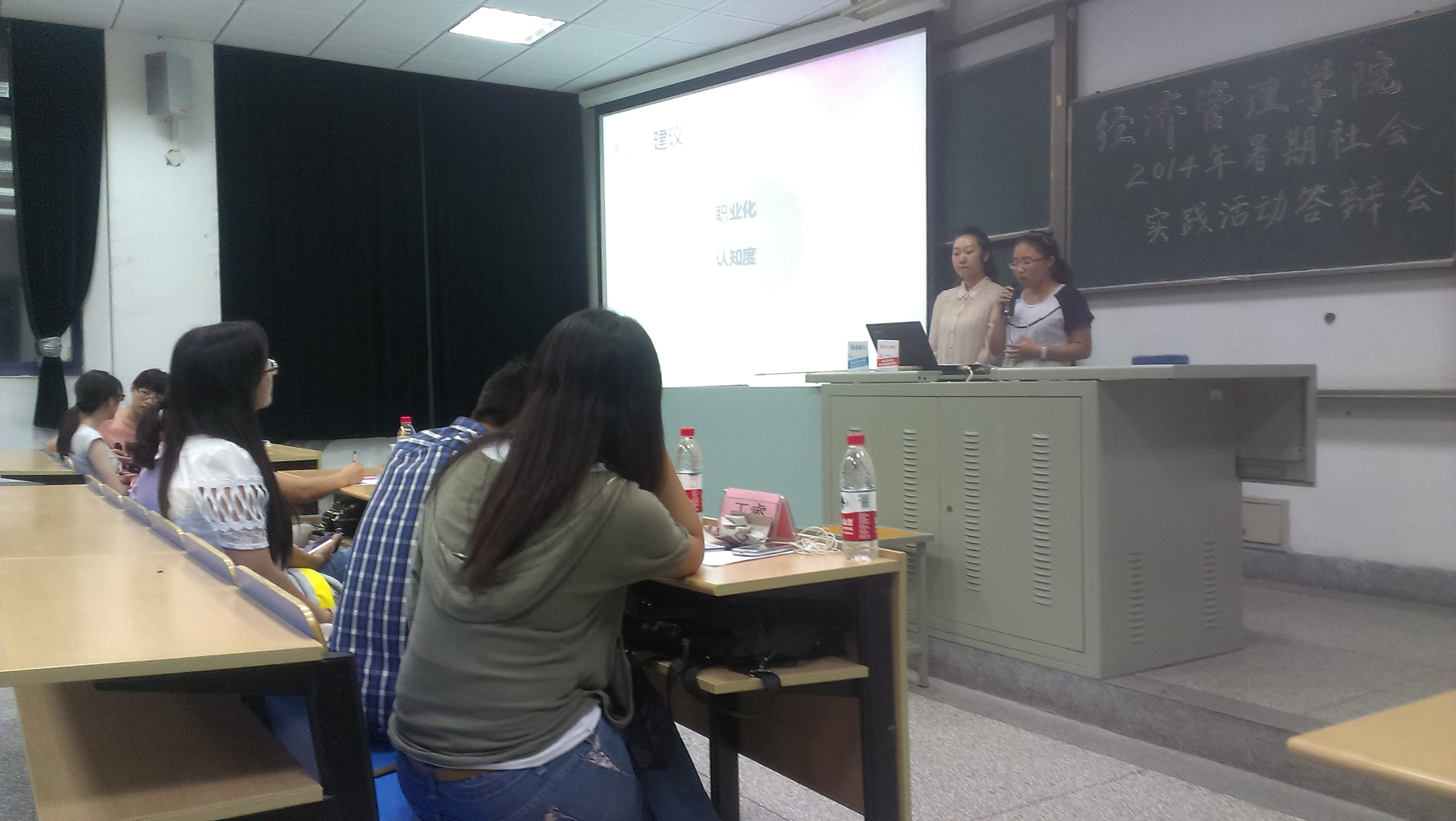 2014年9月10日晚18时30分,由bat365在线中国官网登录入口团委主办的bat365在线中国官网登录入口2014暑期社会实践答辩会于教四202举行。参与此次答辩会的评委有bat365在线中国官网登录入口团委书记林琼老师、辅导员王逢凤老师、上届优秀实践团队代表贾茹同学以及学生代表张钒同学、王睿同学。