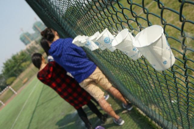 小组PK第二轮:杯水传情。小组成员们用嘴叼纸杯将水传递,最后一人汇总到围栏的杯子里。为了顺利完成任务,同学们研究了各种叼杯子的方法,各种传递姿势与技巧,最后衣服被水淋透,也都一笑而过。