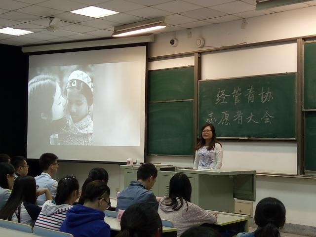 当日下午5点,会长团,部长团以及全体干事全部到场,完成相关会前准备工作。大会于6点正式开始,主持人发言,简要介绍了此次大会的情况并一一介绍到场的特邀嘉宾。随后会长王晓郡致辞,表达了对到场人员的感谢以及对志愿服务事业美好的展望。在主持人介绍志愿者的认定奖励办法后,2名2014届优秀志愿者一次发言,现场志愿者认真倾听。大会最后阶段是各项目组负责人介绍相应志愿服务项目,包括宁馨阳光家园活动,关爱患病儿童活动,鼓楼图书馆活动,南京南地铁站活动,秣陵敬老院活动和秦淮二小支教活动。现场志愿者积极响应,纷纷举手提问,负责人一一解答。最后由志愿者选择心仪的志愿服务项目报名参与。最后主持人宣布大会结束,嘉宾和志愿者有序离场。