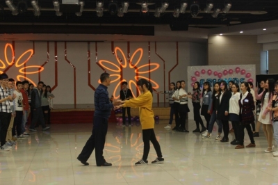 第三部分为自由舞会,同学们跟随舞蹈老师学习简单的交谊舞,然后邀请舞伴自由舞蹈,两人进一步交谈了解,之后所有嘉宾包括观众和工作人员在欢快的兔子舞中结束了舞会环节。