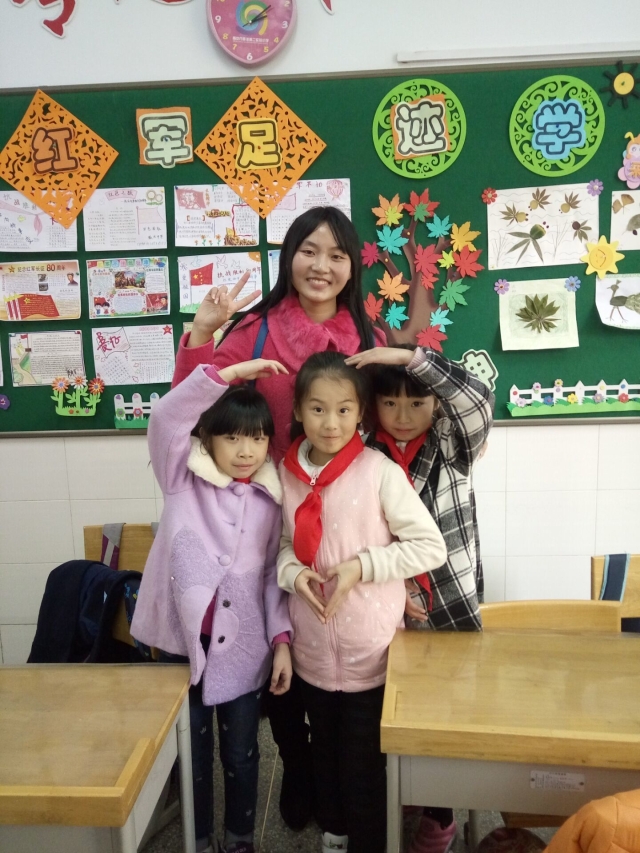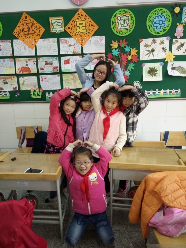 随着上课铃响,志愿者们分成两组,分别进入了两个教室。初次见面都是激动而愉悦的,小朋友们热情地欢迎志愿者,志愿者也积极地回应他们。