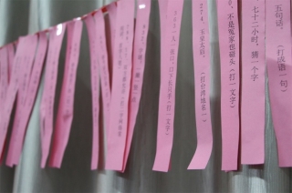 此次比赛形式是由工作人员是事先在教室四周的绳上挂着1000道传统文化题库,比赛参与者随机挑选题目作答,收集好认为能作答的题目到计分的同学那边校对,答对一题加一分,答错扣一分,最后由计分同学统计总分并记录名次。