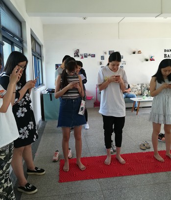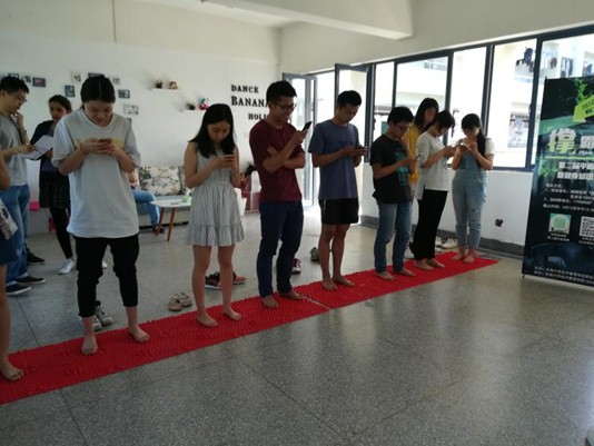 在问答环节中,第一轮是,由前面平板支撑前八名同学站在指压板答手机上的调查问卷题。