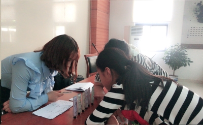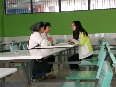 2017年4月22日下午,志愿者在食堂询问后勤阿姨们想要了解的金融知识以及相关的问题。根据搜集的问题,志愿者们整理资料制作讲解的材料。