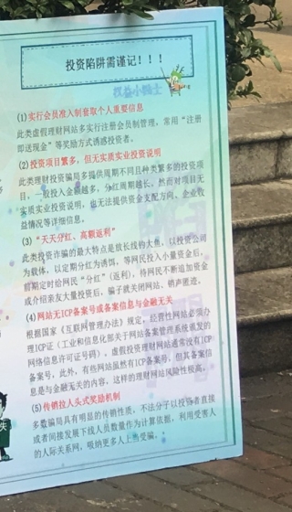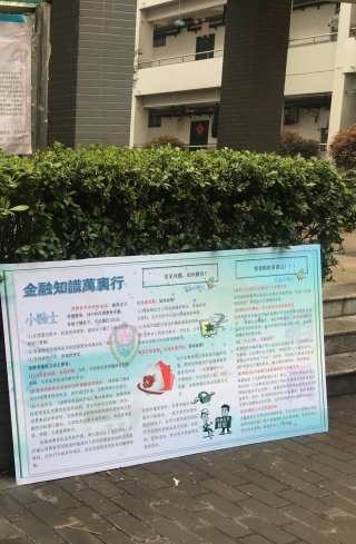前两项活动结束后,志愿者们立即整理相关活动资料和图片,制作展板,为最后一个针对大学生的金融知识普及环节做准备。2017年5月16日,志愿者们将制作好的展板摆放于宿舍内大道两旁,学生们每天都能路过并关注其内容。