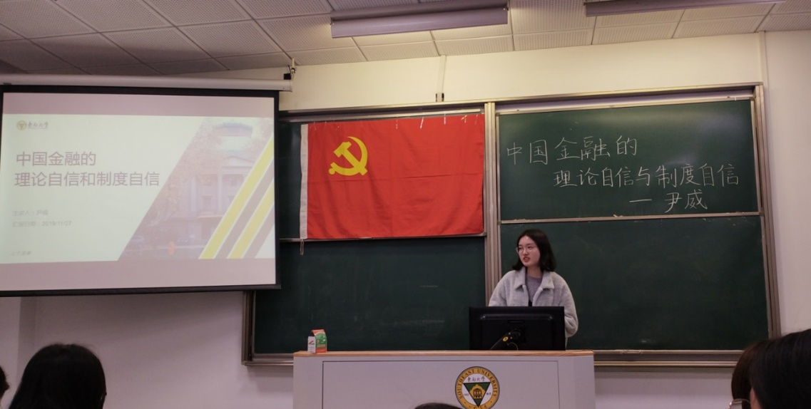 现场气氛热烈,活动取得了圆满成功,传递了真知灼见,树立了坚定信仰。对于金融系的学生党员来说,本次活动不仅让我们对金融领域的专业知识有进一步的拓展,对于党在经济、金融领域方面的工作也有了更深的了解。习近平总书记在2016年7月1日庆祝中国共产党成立95周年大会上说,“全党要坚定道路自信、理论自信、制度自信、文化自信。当今世界,要说哪个政党、哪个国家、哪个民族能够自信的话,那中国共产党、中华人民共和国、中华民族是最有理由自信的。”我们作为金融专业的学习者,未来金融领域的从业者,更要坚持中国金融的理论自信和制度自信,坚定理想信念,不忘初心,牢记使命,砥砺前行!