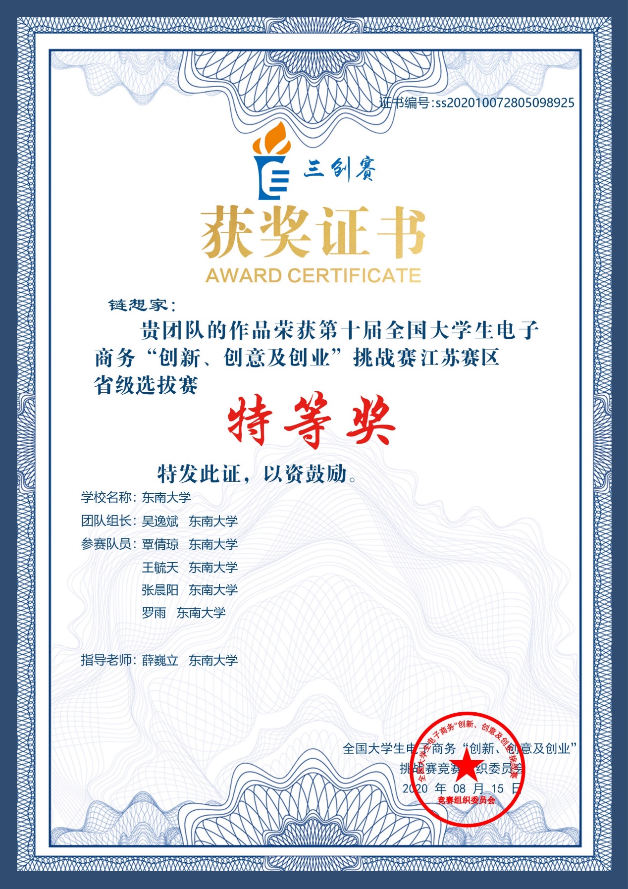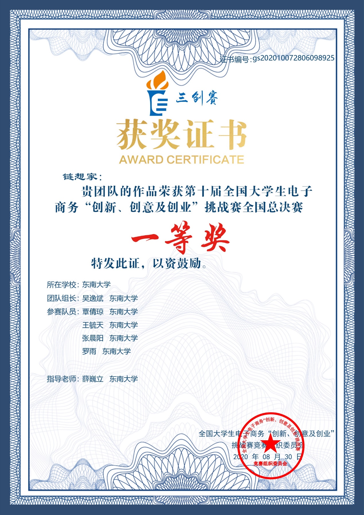2020年8月22日上午,伴随着颁奖典礼和闭幕式的结束,第十届全国大学生电子商务“创新、创意及创业”挑战赛圆满落幕。在bat365官网薛巍立老师的指导下,物流管理专业吴逸斌所带领的 “链想家”团队历经校赛、省赛、国赛,历时数月,斩获省级选拔赛特等奖、省级选拔赛最佳创意奖,最终取得了全国一等奖的好成绩。薛巍立老师也获得了省级选拔赛和全国总决赛优秀指导老师奖项。