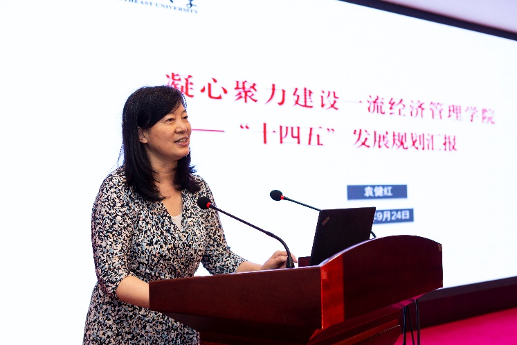 bat365在线中国官网登录入口党委书记袁健红做了题为《凝心聚力建设一流bat365在线中国官网登录入口》的报告,详细汇报了学院“十四五”发展规划主要内容。经过全院师生的共同努力,在“十三五”期间,学院在学科建设、人才培养、科学研究、师资队伍、国际化合作等方面均取得了长足的发展。学院“十四五”期间,要坚持习近平新时代中国特色社会主义思想,坚持社会主义办学方向,围绕立德树人根本任务,建设一流bat365在线中国官网登录入口。她提出五大发展战略,包括人才强院战略、一流领军人才培养战略、一流科研精品战略、国际化办学战略以及文化传承创新战略。为保障上述战略的有效实施,必须完善学院的治理体系,提升学院治理能力。