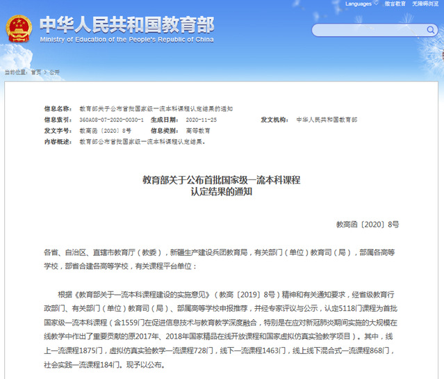 据悉,根据《教育部关于一流本科课程建设的实施意见》(教高〔2019〕8号)精神和有关通知要求,经省级教育行政部门、有关部门(单位)教育司(局)、部属高等学校申报推荐,并经专家评议与公示,认定5118门课程为首批国家级一流本科课程(含1559门在促进信息技术与教育教学深度融合,特别是在应对新冠肺炎期间实施的大规模在线教学中作出了重要贡献的原2017年、2018年国家精品在线开放课程和国家虚拟仿真实验教学项目)。其中,线上一流课程1875门,虚拟仿真实验教学一流课程728门,线下一流课程1463门,线上线下混合式一流课程868门,社会实践一流课程184门。