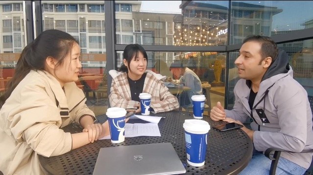 图六 有朋自远方来实践团队成员采访来华留学的国外学生