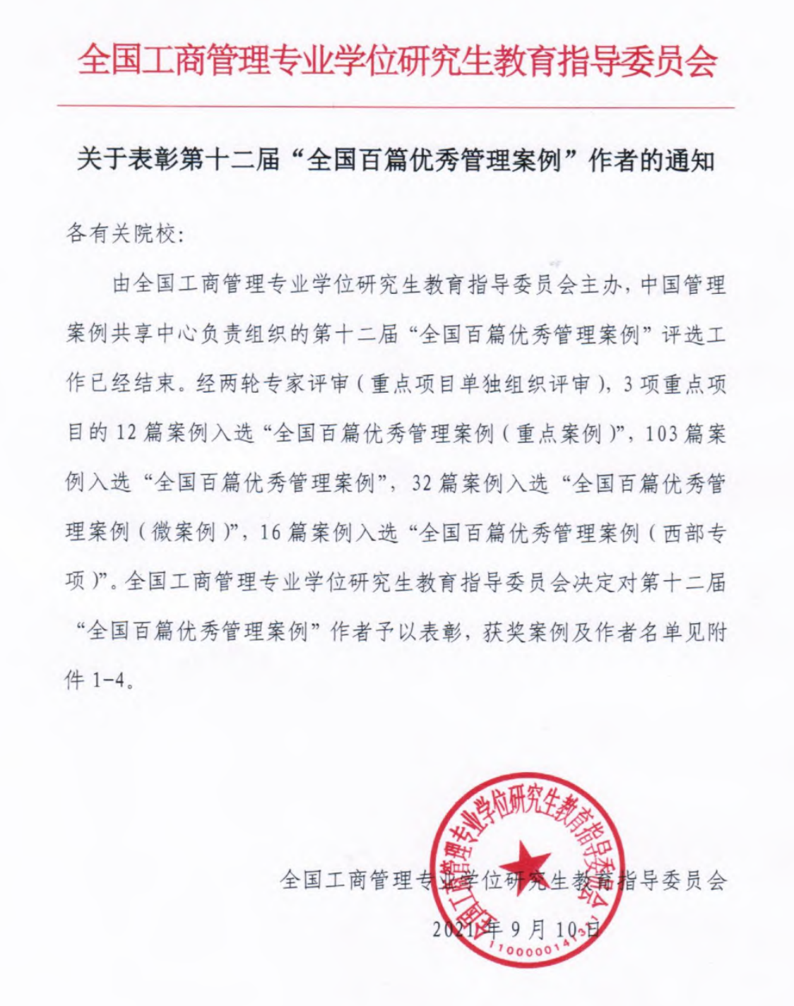 本届“百优案例”评选于2021年3月24日启动,共收到来自全国147所院校的1088项投稿,其中重点项目15项,一般项目734项,微案例专项230项,西部专项109项,获得企业授权的案例751项,占案例总数的69%。经严密审核,匿名遴选和专家会审后,最终确定3所院校的3个立项12篇案例入选“全国百篇优秀管理案例(重点案例)”,64所院校的103篇案例入选“全国百篇优秀管理案例”,23所院校的32篇案例入选“全国百篇优秀管理案例(微案例)”,14所院校的16篇案例入选“全国百篇优秀管理案例(西部专项)”。