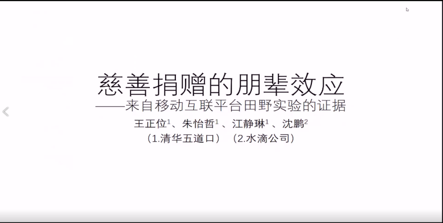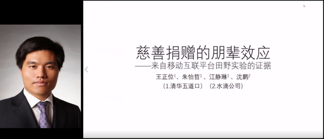 清华大学五道口金融学院副院长、党委副书记王正位教授利用国内互联网大病捐助平台水滴筹设计田野实验,探讨在线社交平台上捐赠行为的朋辈效应。研究表明,潜在捐赠人的个人特征和募捐项目的项目特征均会影响同伴效应。![]()