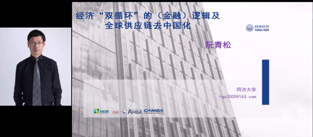 同济大学经济与管理学院副院长、党委副书记阮青松教授从经济“双循环”的视角,分享了关于我国经济双循环的金融逻辑与破局点选择的相关观点和看法。