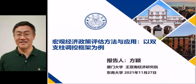 简短开幕式后,大会进入嘉宾主旨演讲环节。厦门大学方颖教授以“货币政策和宏观审慎双支柱调控框架的政策效应:基于宏观经济政策评估视角”为主题,以Rubin因果效应框架量化评估2007-2017年我国货币政策和宏观审慎双支柱调控对经济增长、物价稳定及金融稳定的影响。