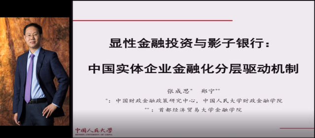 中国人民大学财政金融学院副院长张成思教授做了基于“中国实业部门金融化分层驱动机制”的学术报告,将实体企业所持有的影子银行资产纳入到企业金融化的研究范畴,从理论机制上推演实体企业在传统金融投资和影子银行两个不同层次金融化的驱动逻辑。