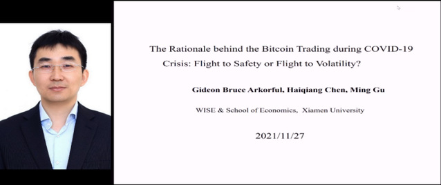 厦门大学王亚南经济研究院陈海强教授以“The Rationale behind the Bitcoin Trading during COVID-19 Crisis: Safe haven or Speculative trading”为主题,分享了新冠疫情影响下,不同投资者进行比特币交易的目的,并发现新冠疫情影响下,短期投机的比特币持有者交易量显著增加。