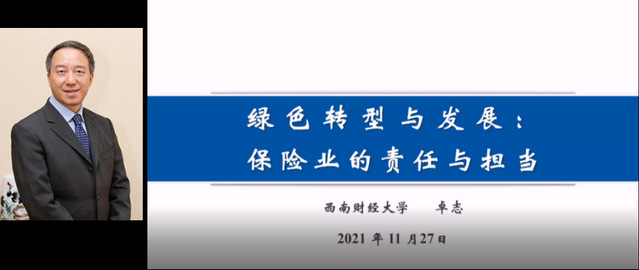 西南财经大学校长、党委副书记卓志教授以“绿色转型与发展”为研究主题,分享了在绿色转型与发展过程中保险业的责任与担当,为当前保险企业经营策略与产品设计提供了参考。