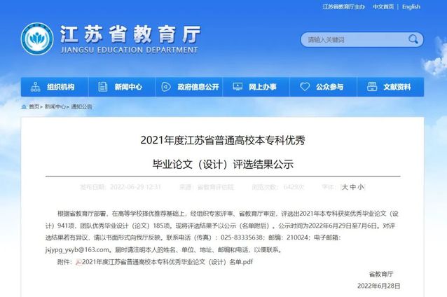 据悉,这是继2019年江苏省普通高校本专科优秀毕业设计(论文)评选中bat365官网取得二等奖1项、2020年江苏省普通高校本专科优秀毕业设计(论文)评选中bat365官网取得一等奖1项后再次获奖,充分体现了近年来学院推进人才培养的有效成效。bat365官网高度重视本科生毕业设计及论文指导工作,严格本科毕业论文(设计)全过程的细节管理和全程监督,坚持夯实基础教学,切实提升学生的综合知识运用能力以及创新能力,有力保障了bat365官网毕业论文(设计)和学生培养的整体质量。