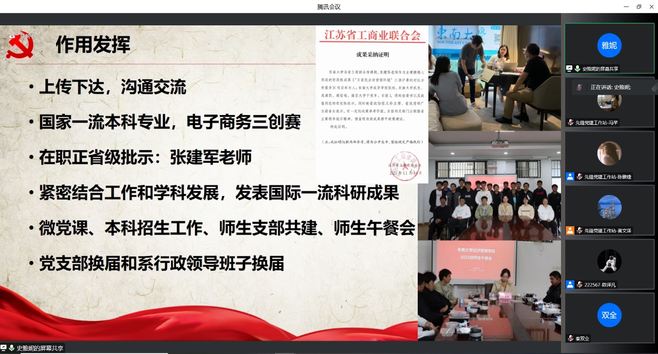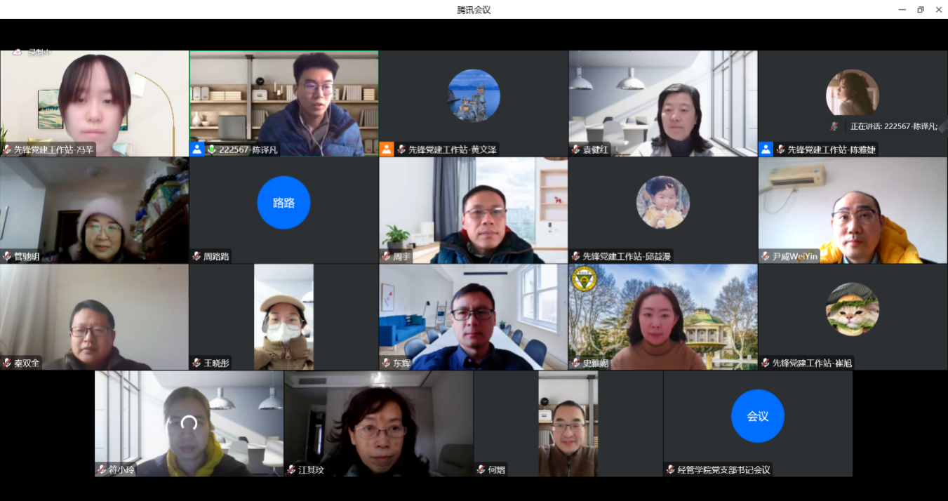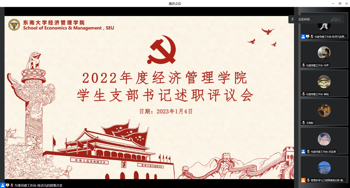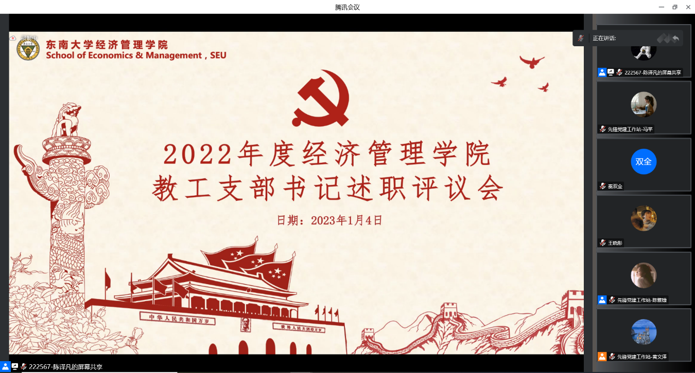 1月4日,bat365在线中国官网登录入口2022年度全院支部书记述职会议在腾讯会议线上顺利召开。学院党委书记袁健红老师、党委副书记兼副院长何熠老师、全体教工、学生支部书记以及辅导员代表等出席。会议由先锋党建工作站陈译凡同学主持。