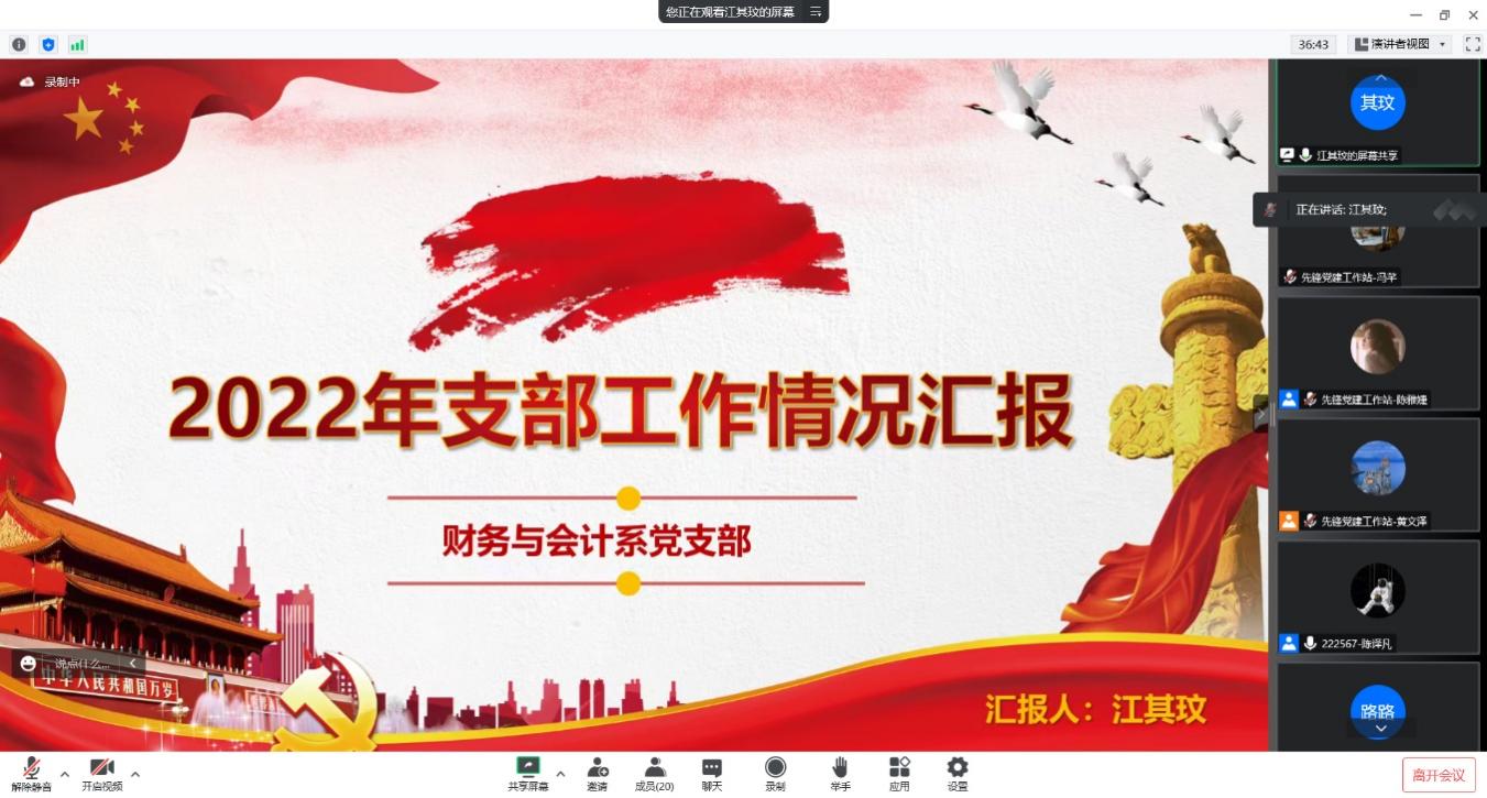 财务与会计系党支部书记江其玟老师介绍了支部年度内开展的党日活动,强调支部一直不断完善谈心谈话制度,并表示将秉持“为党育人、为国育才”的初心使命,进一步促进党建和学科建设深度融合。