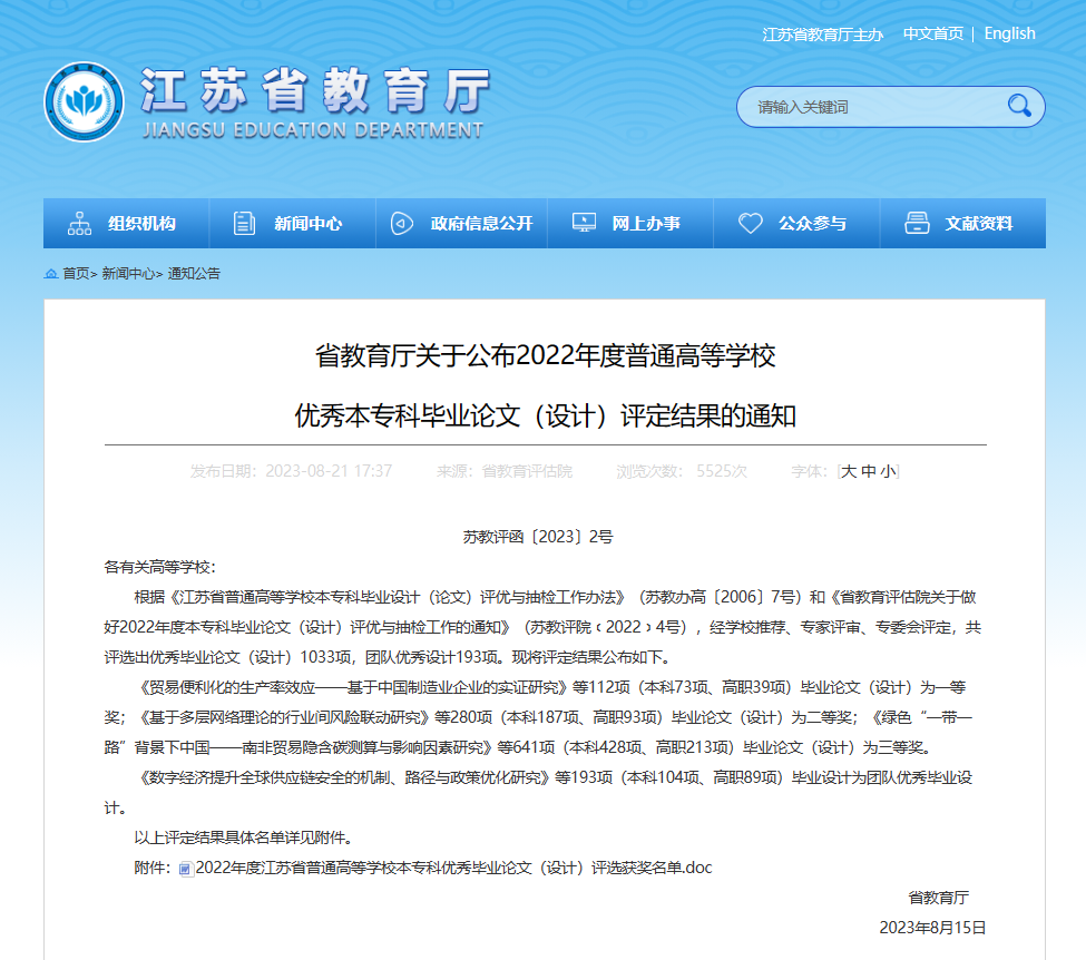 近日,江苏省教育厅发布了《关于公布2022年度普通高等学校优秀本专科毕业论文(设计)评定结果的通知》(苏教评函〔2023〕2号),我校获优秀毕业设计(论文)一等奖6项,二等奖6项,三等奖7项,团队毕业设计(论文)3项。一等奖获奖数量位列全省第一。