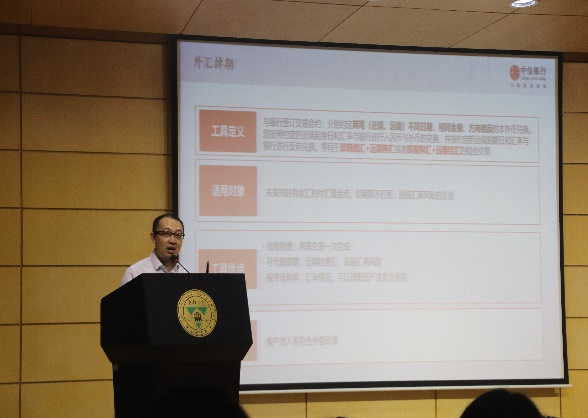 此次讲座在bat365在线中国官网登录入口校歌中拉开帷幕。张天来校友以生动形象的语言讲解了“企业汇率风险管理的理论及实践”。他在演讲中指出,引发汇率波动的根本原因是外汇市场的供求关系变化,例如由跨境收支引发的不同货币交易需求变化、由市场参与者对未来的预期变化引发的不同货币交易需求变化以及政府主动调控汇率的引发的交易需求变化。又以美元指数为例分析了外汇市场概况,简析了汇率风险的来源以及汇率避险的办法和核心策略。