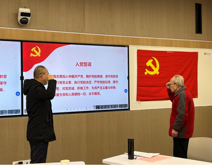 1月17日,bat365在线中国官网登录入口退休教工党支部在四牌楼校区东南院305如期举行了新发展党员入党宣誓仪式,活动由bat365在线中国官网登录入口党委书记袁健红主持,学院党委副书记尹威领誓。在会上,袁振铎介绍了自己一生坚定理想信仰、矢志不渝不忘初心的故事,并分享了自己的感悟:“我认为,入党誓词是一份政治誓言、一份忠诚承诺,也是一份责任担当,是我们全体共产党员共同的行为准则,我们必须时时牢记,刻刻遵循。我作为一名退休的老教师,虽然已经跨入耄耋之龄,但老骥伏枥,壮志不已!我决心以我余生,为党的教育事业发展,为实现共产主义目标,添砖加瓦,献我中华!”