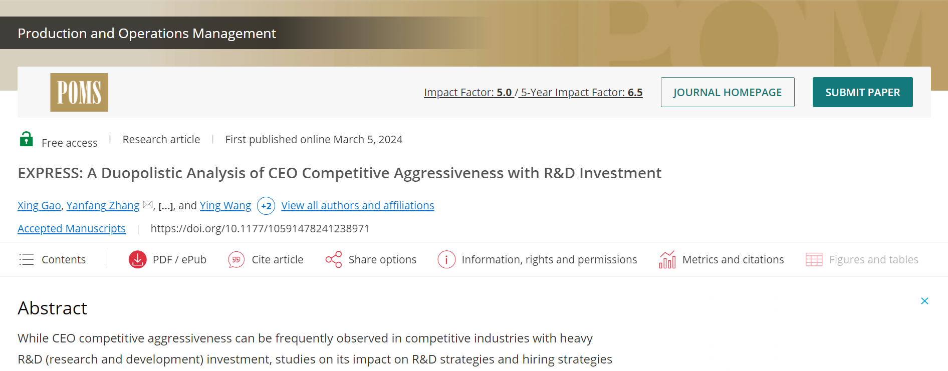 近日,bat365在线中国官网登录入口高星老师课题组2021级管理科学与工程专业硕士研究生王惜凡、物流工程与管理专业硕士研究生王颖与合作者在管理学国际顶级期刊《Production and Operations Management》上在线发表学术论文“A duopolistic analysis of CEO competitive aggressiveness with R&D investment”。据悉,《Production and Operations Management》(POM)是全球公认的UT DALLAS商学院24种国际顶级期刊(UTD24)之一,以其在运筹管理领域的突出影响力著称。