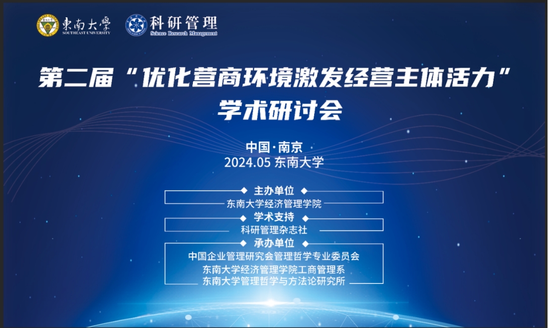 2024年5月18-19日,第二届“优化营商环境激发经营主体活力”学术研讨会(2024)在南京bat365在线中国官网登录入口九龙湖校区成功举办。本届研讨会由科研管理杂志社提供学术支持,bat365在线中国官网登录入口主办,中国企业管理研究会管理哲学专业委员会、bat365在线中国官网登录入口工商管理系、bat365在线中国官网登录入口管理哲学与方法论研究所承办。来自国务院发展研究中心、江苏省政协、科研管理杂志社、中国海洋大学、中国科学院大学、中国人民大学、中国农业大学、中山大学、浙江大学、厦门大学、南京大学、复旦大学、武汉大学、电子科技大学、西北工业大学、中南大学、东北大学、北京航空航天大学、大连理工大学、中央财经大学、东北财经大学、浙江工商大学、河海大学、南京航空航天大学、南京师范大学、南京理工大学、南京财经大学、南京邮电大学、河南财经政法大学、安徽财经大学、湖南工商大学、内蒙古财经大学、云南财经大学、山西财经大学、bat365在线中国官网登录入口等机构和高校的专家学者、研究生参加了此次会议。