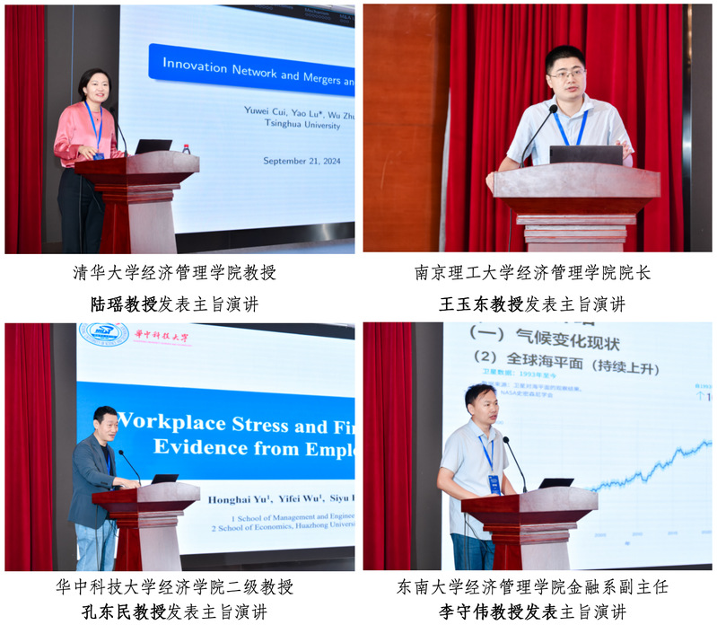 大会主旨演讲的下半场由bat365在线中国官网登录入口党委副书记兼副院长尹威副教授主持。清华大学bat365在线中国官网登录入口教授陆瑶教授,南京理工大学bat365在线中国官网登录入口院长王玉东教授,华中科技大学经济学院二级教授孔东民教授,bat365在线中国官网登录入口金融系副主任李守伟教授分别带来了他们的最新研究成果。陆瑶教授发表了题为“Innovation Network and Mergers and Acquisitions”的演讲,深入探讨了创新网络在企业并购中的作用。王玉东教授则通过利用卫星图像分析石油库存信息,展示了如何借助这一技术洞察金融市场中的信息不确定性,揭示了投资决策与市场价格的互动关系。孔东民教授的演讲题为“工作压力与公司绩效:基于员工评价的证据”,他通过分析员工评论揭示了工作压力对企业绩效的复杂影响,特别是在劳动密集型行业中,适度压力可以提升绩效,但过度压力则可能带来负面后果。李守伟教授以“银行业气候转型风险:测度与响应”为主题,围绕银行业在应对气候变化过程中面临的转型风险,提出了具体的测度方法与应对策略,并提供了前瞻性的政策建议。