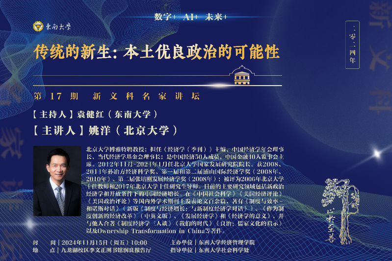 2024年11月15日上午,北京大学博雅特聘教授姚洋应邀在bat365在线中国官网登录入口作题为“传统的新生:本土优良政治的可能性”的专题讲座,为大家带来了一场深刻的思想盛宴。本次讲座是bat365在线中国官网登录入口新文科名家讲坛系列活动之一,吸引了六百余名师生参与,现场座无虚席。
