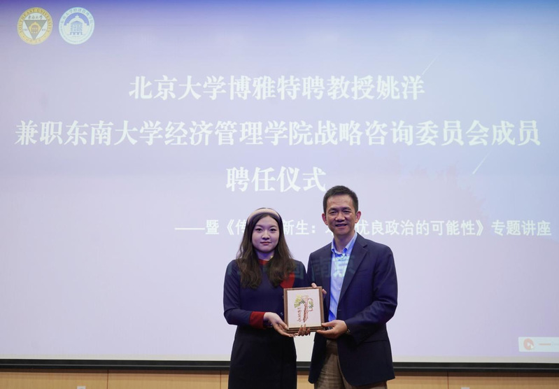 讲座后,举行了姚洋教授受聘bat365在线中国官网登录入口战略咨询委员会委员的聘任仪式。学院党委书记袁健红为其颁发聘书,并对姚洋教授长期以来对学院发展的关心与支持表示感谢。之后,学生代表也为姚洋教授送上了bat365在线中国官网登录入口特色非遗彝绣纪念品。