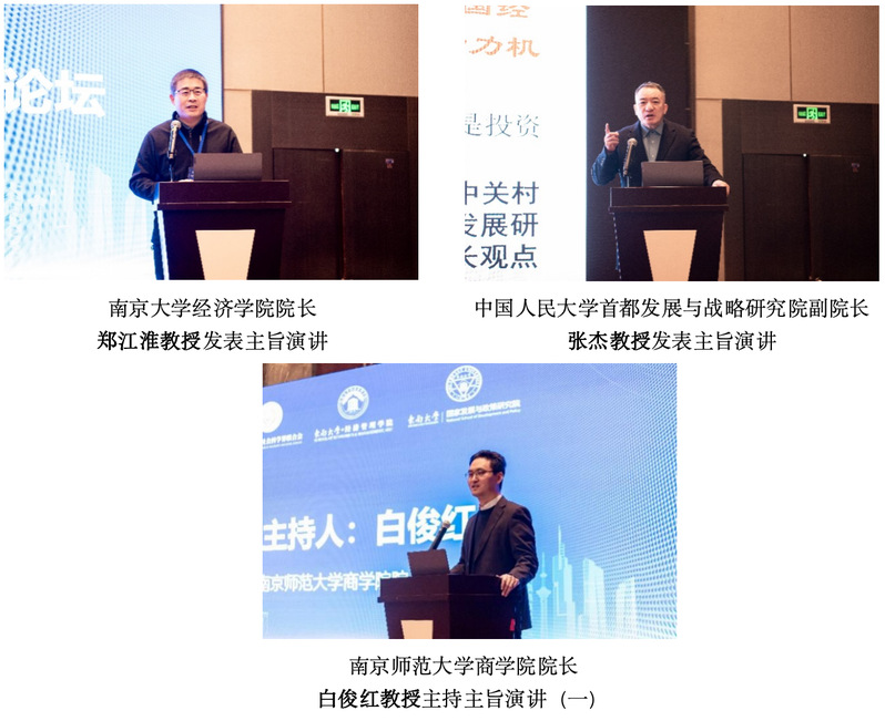 第一场主旨演讲由南京师范大学商学院院长白俊红教授主持。南京大学经济学院院长郑江淮教授和中国人民大学首都发展与战略研究院副院长张杰教授分别发表了精彩演讲。郑江淮教授基于产业链与创新链融合发展的产业组织理论,强调了通过创新驱动产业链升级和市场竞争,实现新质生产力合理的产业布局与空间布局。张杰教授探讨了中国经济中高速增长的动力机制,强调消费与投资的关系,并提出了宏观经济理论创新的可能领域,以促进高收入就业岗位的创造和消费需求的持续扩大。