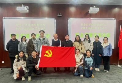 2024年12月24日下午,bat365在线中国官网登录入口党委副书记兼副院长尹威、机关党支部书记周宇、辅导员代表、本研学生党支部成员一行10余人前往中国太平洋人寿保险股份有限公司江苏分公司开展联合党建与校企交流。中国太保寿险江苏分公司党委委员、纪委书记、直属党委书记刘枫及各部门主要负责人参与座谈。本次会议由中国太保寿险江苏分公司党委组织部部长兼组织与人才部总经理董海蓉主持。