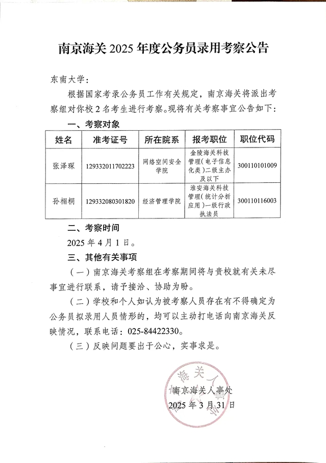 南京海关2025年度公务员录用考察公告