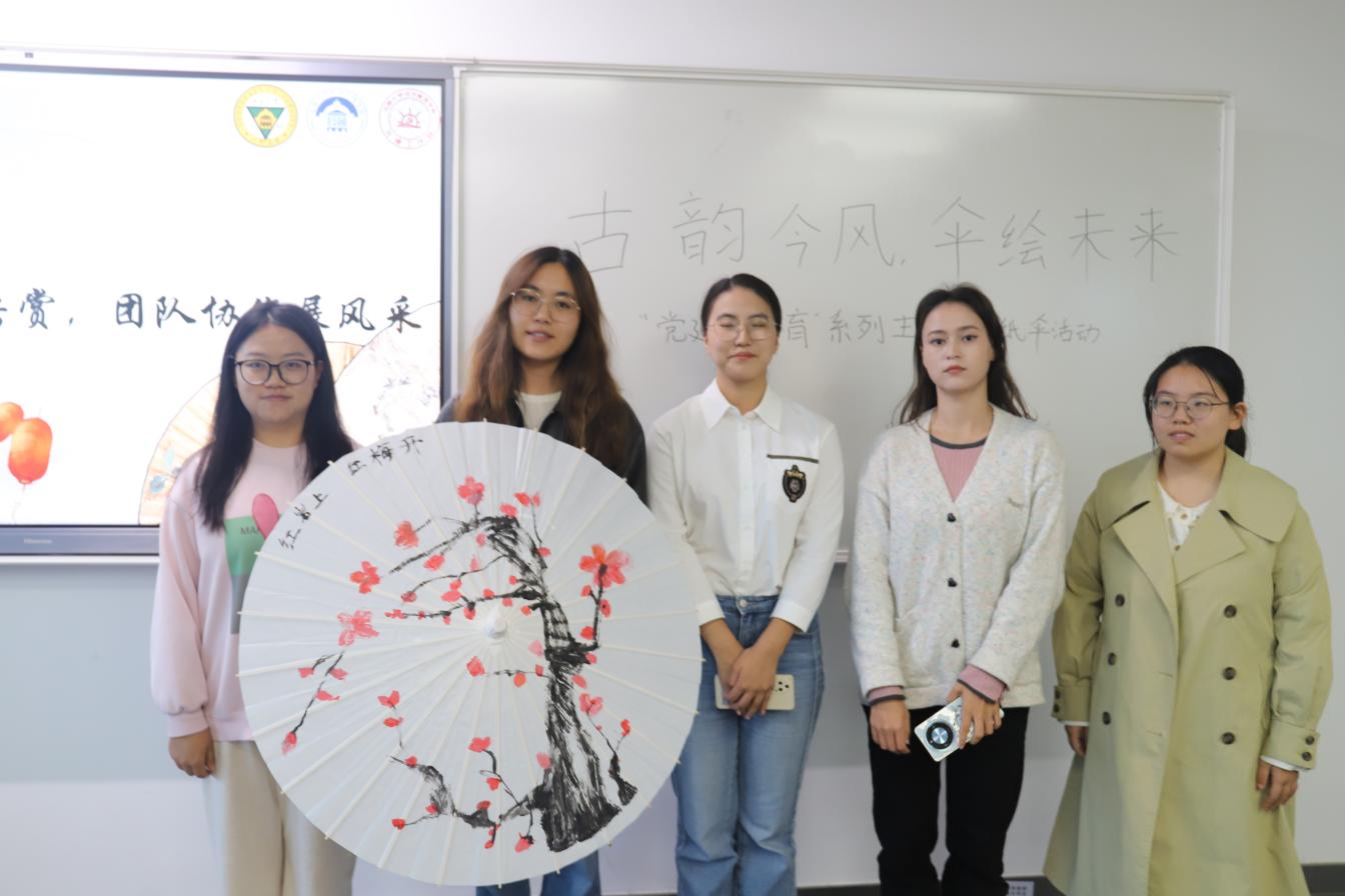 活动中,同学们分组进行党建主题的油纸伞创作,领悟油纸伞在党建环节中的精神内核,感受文化脉络,创新“党史+非遗”的传承模式。同学们围伞而坐,用色彩鲜艳的画笔勾绘出心中的锦绣蓝图,让原本空白单调的伞面顿时焕然一新:傲骨的梅花与坚韧的菊花在伞面上争奇斗艳、雄伟的长城在伞面上蜿蜒起伏、鲜艳的国旗在伞面上熠熠生辉。每一把油纸伞都成为了独一无二的艺术品,它们不仅承载着同学们的想象力和创造力,更寄托着他们对未来的美好憧憬和期待。