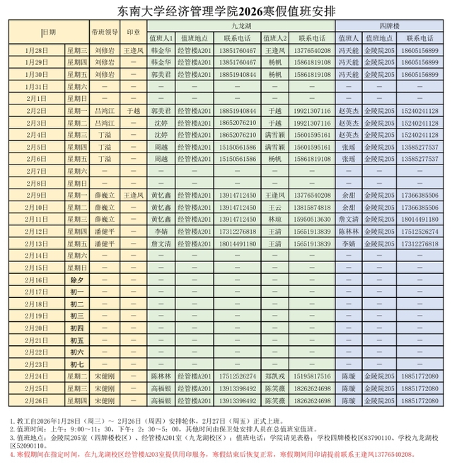 四、寒假期间,印章服务和具体值班安排见下表。