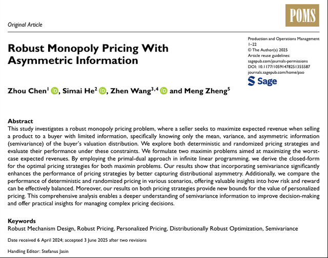 bat365在线中国官网登录入口管理科学与工程系陈洲老师与其合作团队的论文 《Robust Monopoly Pricing With Asymmetric Information》 在线发表于国际管理学顶级期刊    《Production and Operations Management》( POMS )。该研究针对信息不对称环境下的垄断定价问题,提出了融合半方差信息的鲁棒定价新框架,为企业在有限信息条件下设计稳健且高效的定价策略提供了重要理论支持与实践指导。
