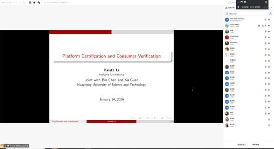 在电商场景中,信息设计可破解质量信息不对称难题,为平台治理与市场良性发展提供理论支撑。为增进学院师生对这一领域的理解,学院于2026年1月15号上午,特邀印第安纳大学凯利商学院讲席正教授李娇阳,举办了主题为《Platform Certification and Consumer Verification》的线上学术讲座。讲座通过构建博弈模型,系统分析了电商平台认证与消费者验证的互动机制及其管理影响,学院相关领域多位教师和众多学生积极参与。