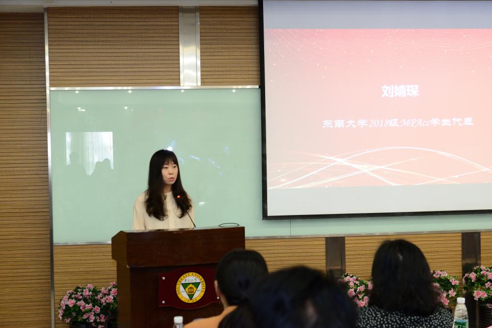 Liu Jingchen, Class President of the 2018 Master of Professional Accounting Class, as a student representative, gave a speech of thanks to the external supervisors and the school