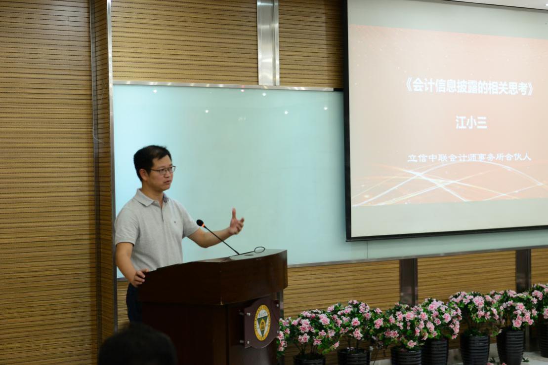 Jiang Xiaosan, a partner of Lixin Zhonglian CPA Firm, gave a presentation entitled "Relevant Thinking on Accounting Information Disclosure" in conjunction with his own work. Mr. Jiang analyzed the motives and talked about some unique insights of his own with regard to the problems of accounting information disclosure of listed companies in China. He instructed the students to be an accountant who sticks to the bottom line and be legally compliant.