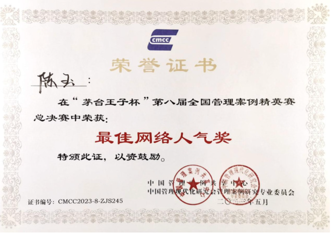 Before the competition, the organizer of the competition collected the popular players from each university and selected the "Best Online Popularity Award" by means of online voting. Chen Yu, the captain of the MBA team from Southeast University, was awarded the prize for her superb popularity.